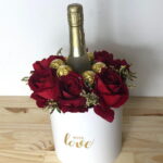 rosas – 25 ud. verdes decorativos – 5 ud. ramo de gipsofila – 1 ud. barras de snickers – 4 ud. caixa de ferrero rocher – 1 ud.